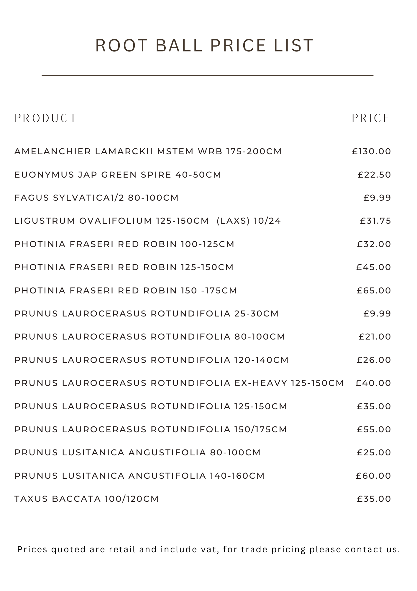 We currently stock a range of Root Balls, which are listed below for your convenience – please note pricing quoted below is retail. Trade pricing is available.