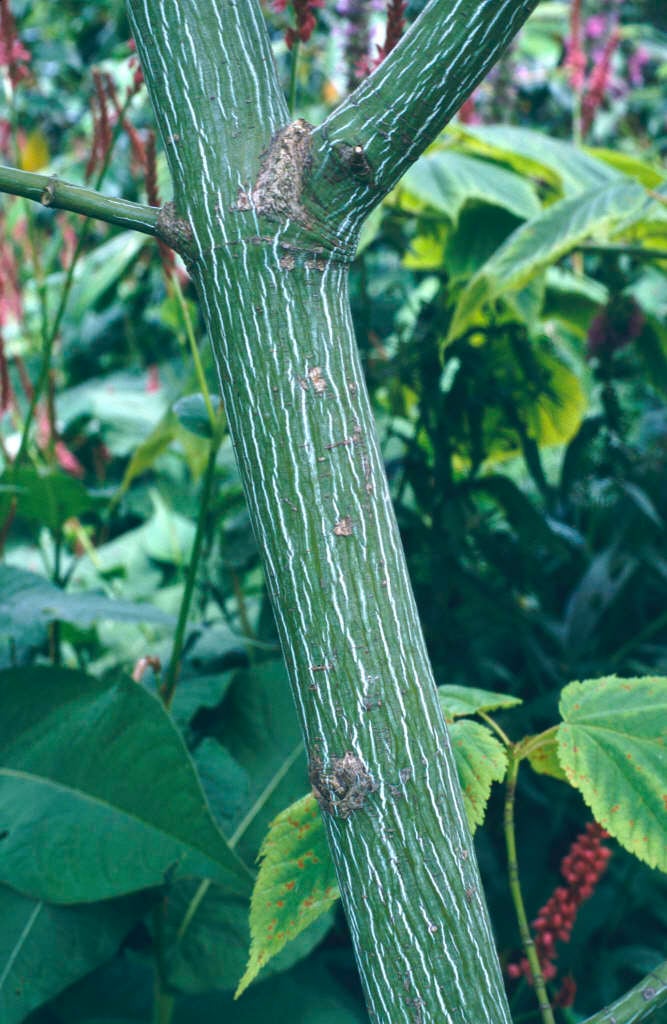 A Snakebark Maple Forming A Medium Sized Deciduous Tree Of Upright Growth. White Striped Green Young Branches With 3 Bobed Large Leaves That Turn Yellow In Autumn. Flowers Are Yellow In Drooping Raccmes.