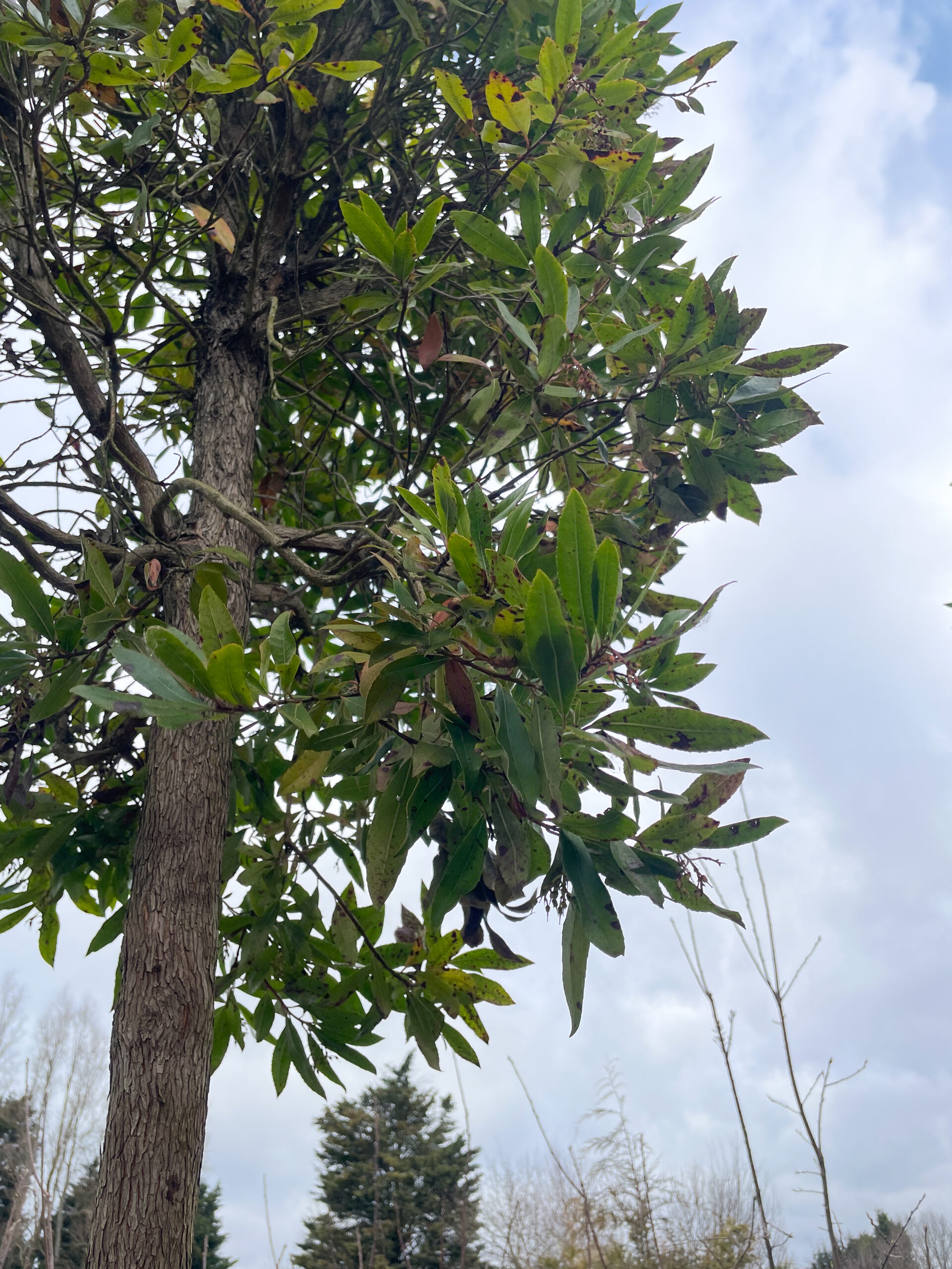Spreading, evergreen, shrubby tree, about 8m tall, with rough shredding red-brown bark and mid-green leathery leaves. Flowers are urn-shaped and white, sometimes pink tinged, appearing in panicles to 5cm long as the strawberry-like red fruits