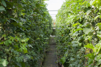 A green screen consists of a steel grid, densely intertwined with climbing plants.