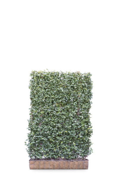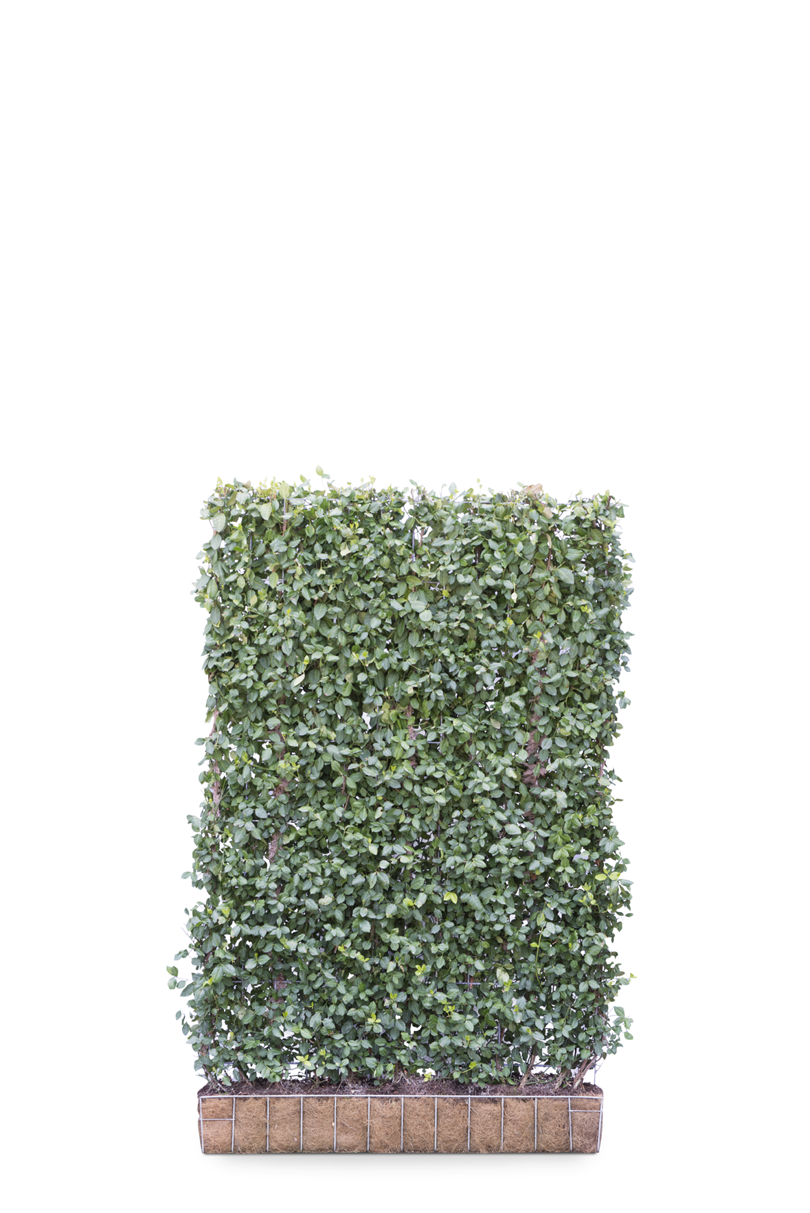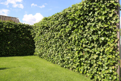 A green screen consists of a steel grid, densely intertwined with climbing plants.