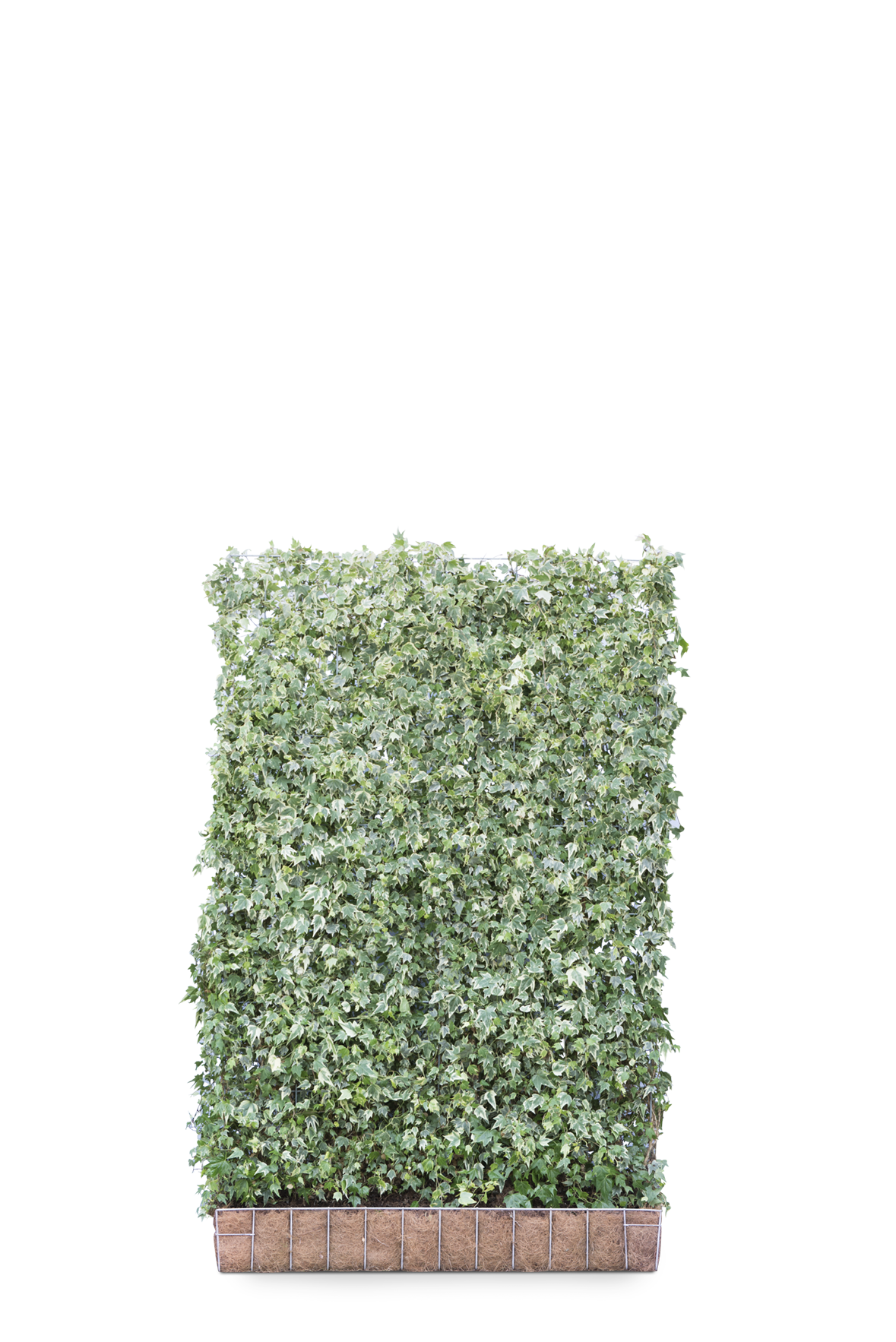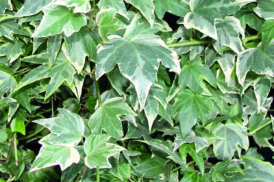 Compact, self-clinging evergreen climber, with greyish-green, finely lobed leaves lightly splashed and edged with white.
