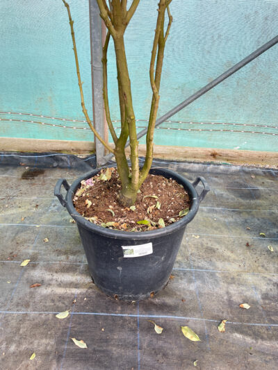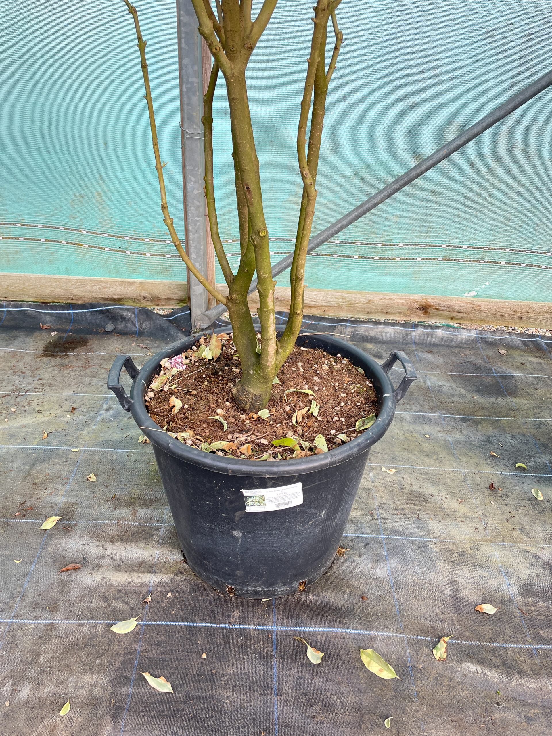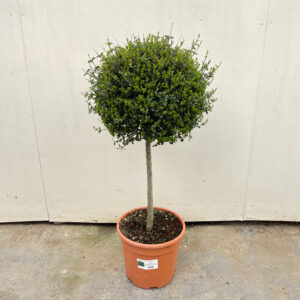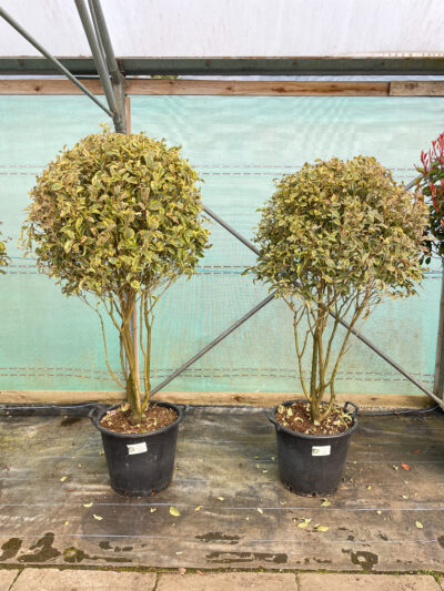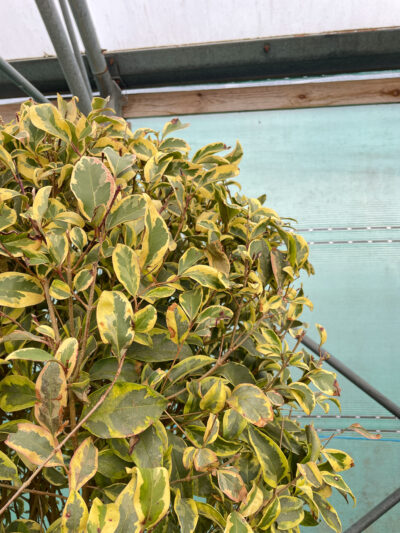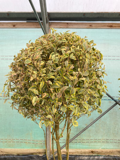 A small evergreen tree with glossy, ovate leaves mottled with light green and edged with creamy-yellow. Flowers small, cream, in panicles to 20cm in length in late summer and early autumn, followed by black berries
