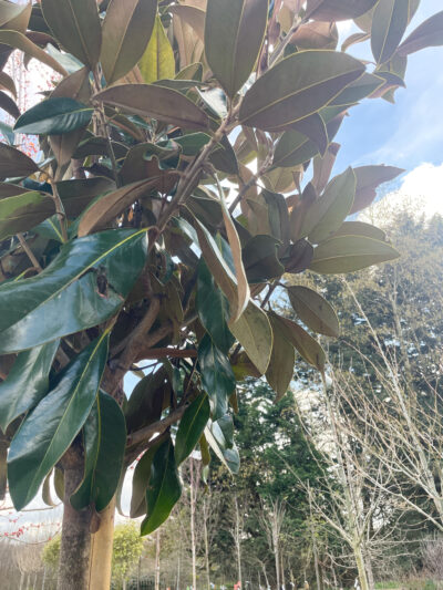 A large, rounded evergreen tree about about 12m tall or more with glossy dark green, leathery, oblong-elliptic leaves, often rusty-brown beneath, and highly fragrant, cup-shaped, cream flowers to 25cm across in late summer and autumn