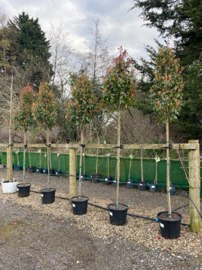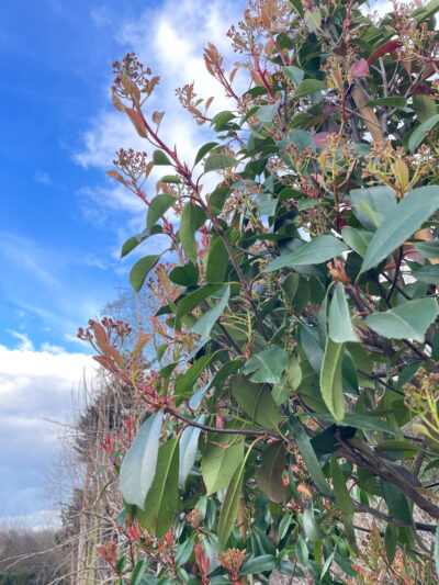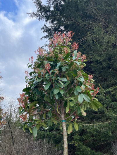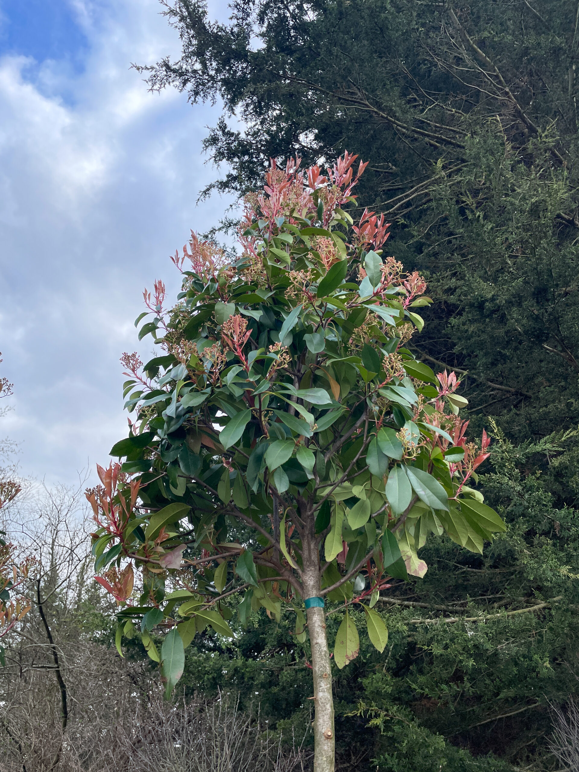 Evergreen shrub or small tree to about 6m tall, with an erect habit, and glossy, elliptic leaves to 10cm in length, bright red when young, later dark green. Clusters of creamy-white flowers appear in spring if left unpruned Quality