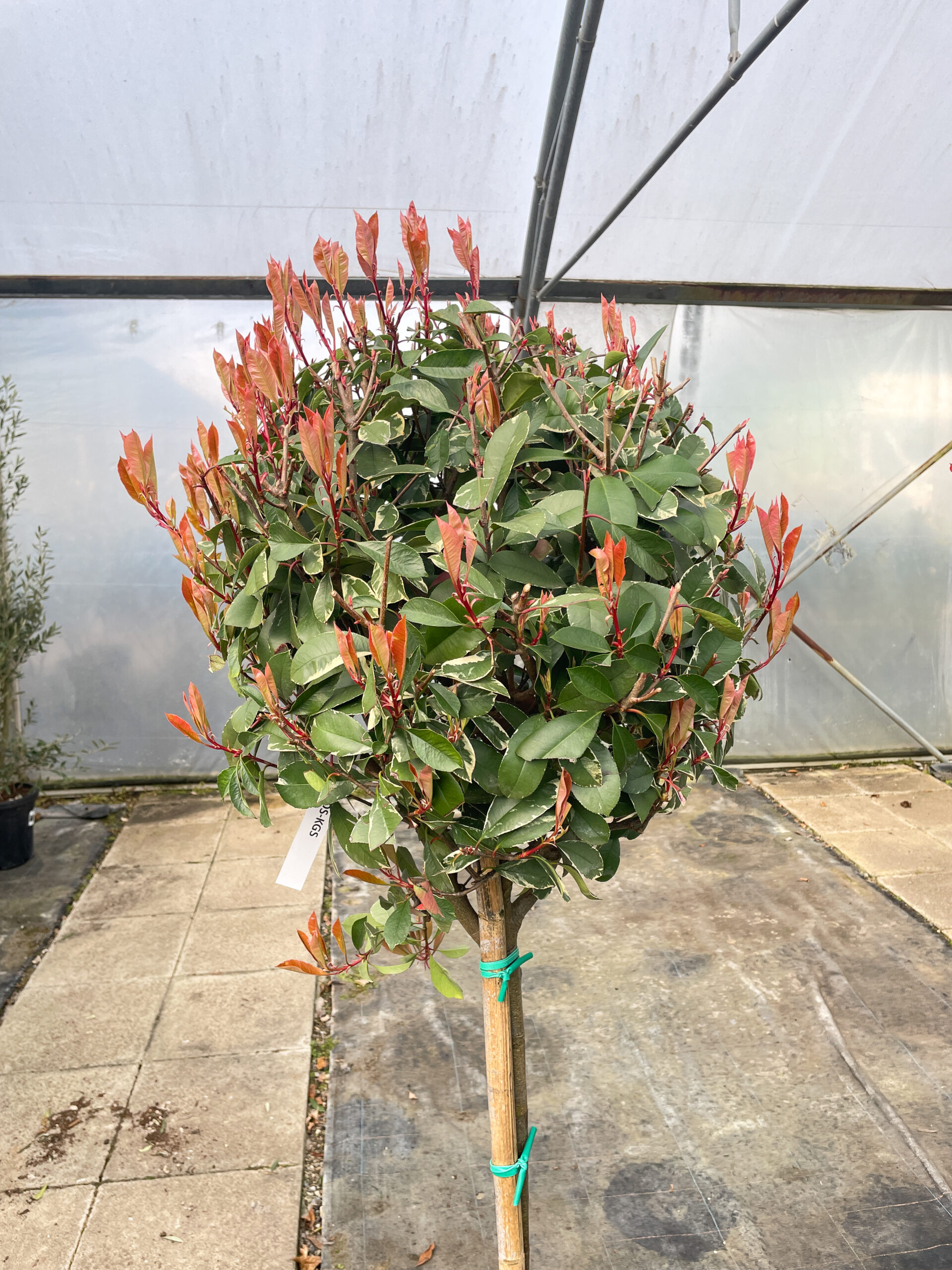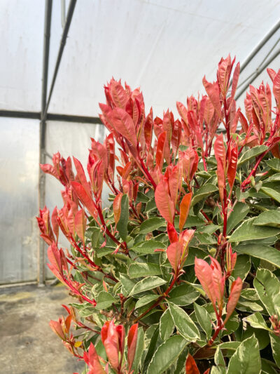 A variegated, evergreen shrub with glossy, leathery, dark green leaves irregularly margined with white and pink. In spring the young leaves are bright coppery red and pink. Sprays of small, creamy-white flowers appear in spring then red hawthorne like berries